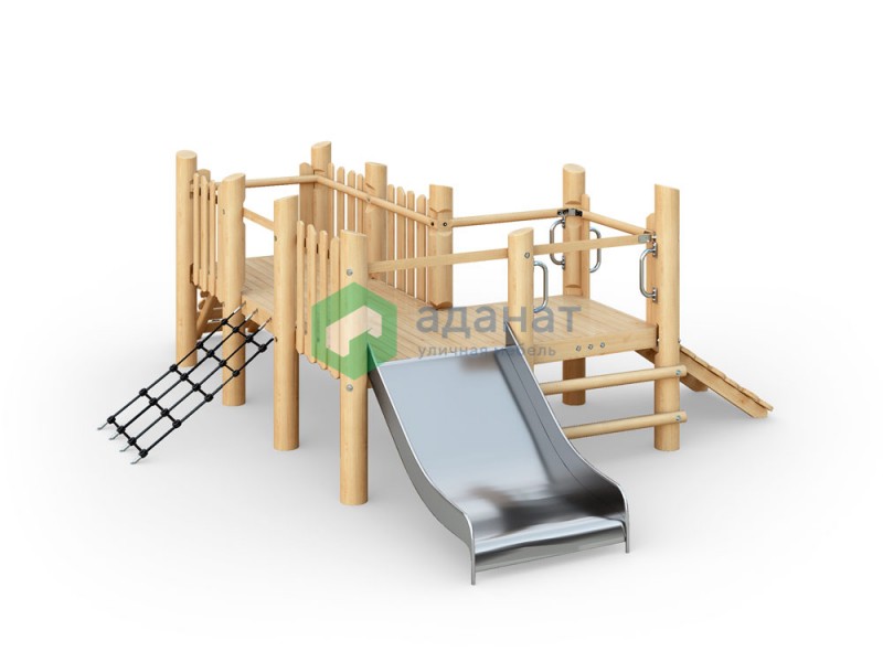 Игровая платформа с горкой и сеткой 6000х4900х1920мм Древесина: лиственница. Покрытие: светлый дуб.