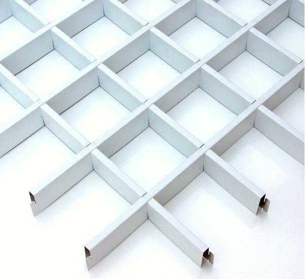 Грильято 100х100 высотой 40 мм белого цвета - это самый популярный вид потолка грильято. Ячейка 100х100 мм оптимальный выбор с точки зрения отношения цены и видимой зона покрытия. Грильято с такой ячейкой устанавливают на высоте более 3 метров. Области применения: